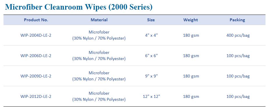 0.1 decitex, knitted extremely tightly to ensure wipe durability. Because of the structure of the yarn (30% Nylon and 70% Polyester) the hydrophilic property of Nylon, loipophilic polyester, along with a capillary effect of the dense fabric constuction, provides a high level of water absorbency and amazing wiping effect. Cleanroom laundered and packaged in ISO Class 4, it is ideal for critical environment application, Low in both Particles and Extractables. Abrasion and Chemical Resistant, Good Sorbency with Solvents. Soft, non-abrasive texture cleans surfaces without scratching. Be used in the electronics, semiconductor, Hard disk drive, Optics-electronic, TFT-LCD, IC, SMT, PCB, medical field, pharmaceutical and biotech industries.